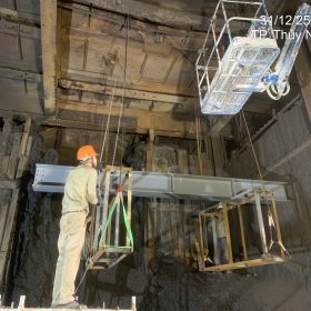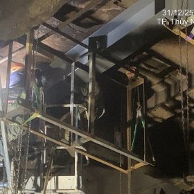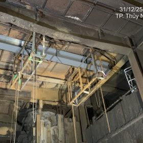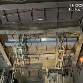 • Biện pháp thi công: Sử dụng hệ thống pa-lăng xích và khung treo chuyên dụng để đưa các cấu kiện dầm thép nặng hơn 550 kg vào vị trí chuẩn xác trong không gian hẹp.